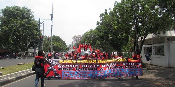 Jakarta, bantuanhukum.or.id-Menyambut pelantikan Presiden dan Wakil Presiden Indonesia terpilih, massa buruh yang tergabung dalam Sentral Gerakan Buruh Nasional (SGBN) melakukan long march dengan rute Tugu Proklamasi, Menteng hingga Bundaran Hotel Indonesia (19/10). Long march tersebut melibatkan ratusan massa buruh yang berasal dari berbagai serikat, diantaranya dari kawasan Karawang, Tanggerang dan Bekasi.