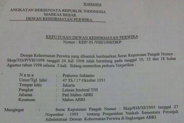 Pengantar Saat ini masyarakat digemparkan dengan beredarnya Surat Keputusan Dewan Kehormatan Perwira (Keputusan DKP) No: KEP/03/VIII/1998/DKP tentang rekomendasi pemberhentian Prabowo…