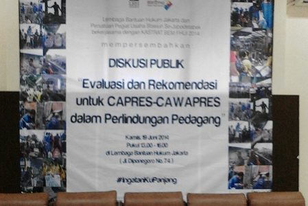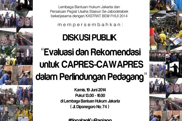 Kamis 19/6/2014, diskusi berjudul “Evaluasi dan Rekomendasi untuk Capres-Cawapres 2014 dalam Perlindungan dan Kesejahteraan Pedagang Stasiun” diselenggarakan di gedung LBH…